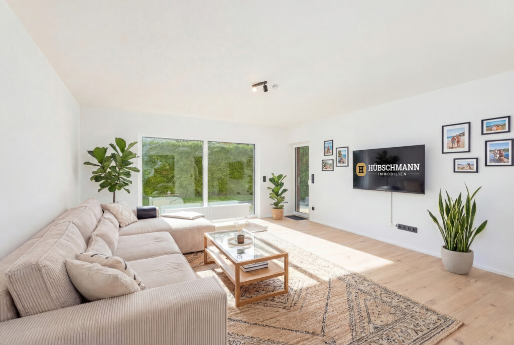 Die zum Garten ausgerichtete Wohnzimmerwand beeindruckt mit einer großen, bodentiefen, doppelt verglasten Fensterfront der Marke Schüco, die für ein außergewöhnlich helles und freundliches Wohnambiente sorgt und einen direkten, ebenerdigen Zugang zur großzügigen Terrasse sowie zum liebevoll angelegten Garten bietet.